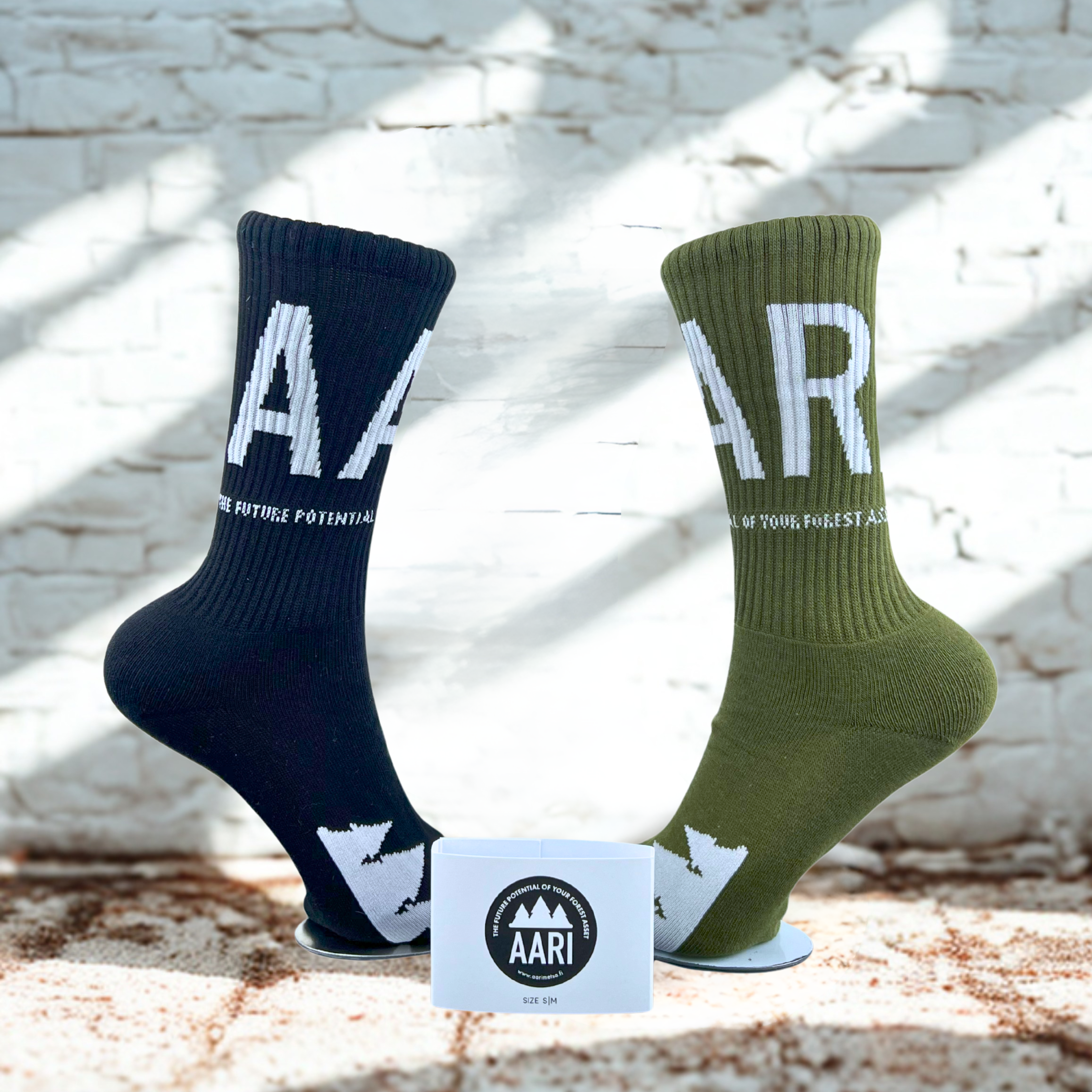 Für AARI entstanden markante Socken in den beiden Farben schwarz und waldgrün – mit starkem Icon & Logo. Eingesetzt bei Mitarbeiter- und Kunden-Events, die die Nähe zur Natur und die Markenidentität perfekt unterstreichen.